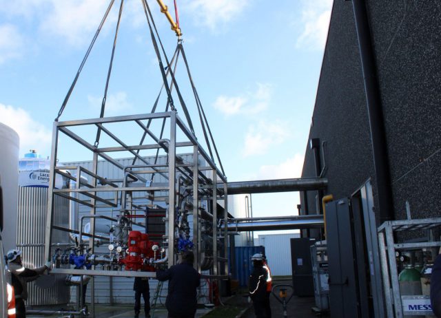 - Transport, livraison et mise en place du châssis skid réseau eau chaude sanitaire sur la dalle existante à l’extérieur et la mise en place du skid eau glacée avec ses tuyauteries et – équipements à l’intérieur de la salle des machines dans son nouvel emplacement